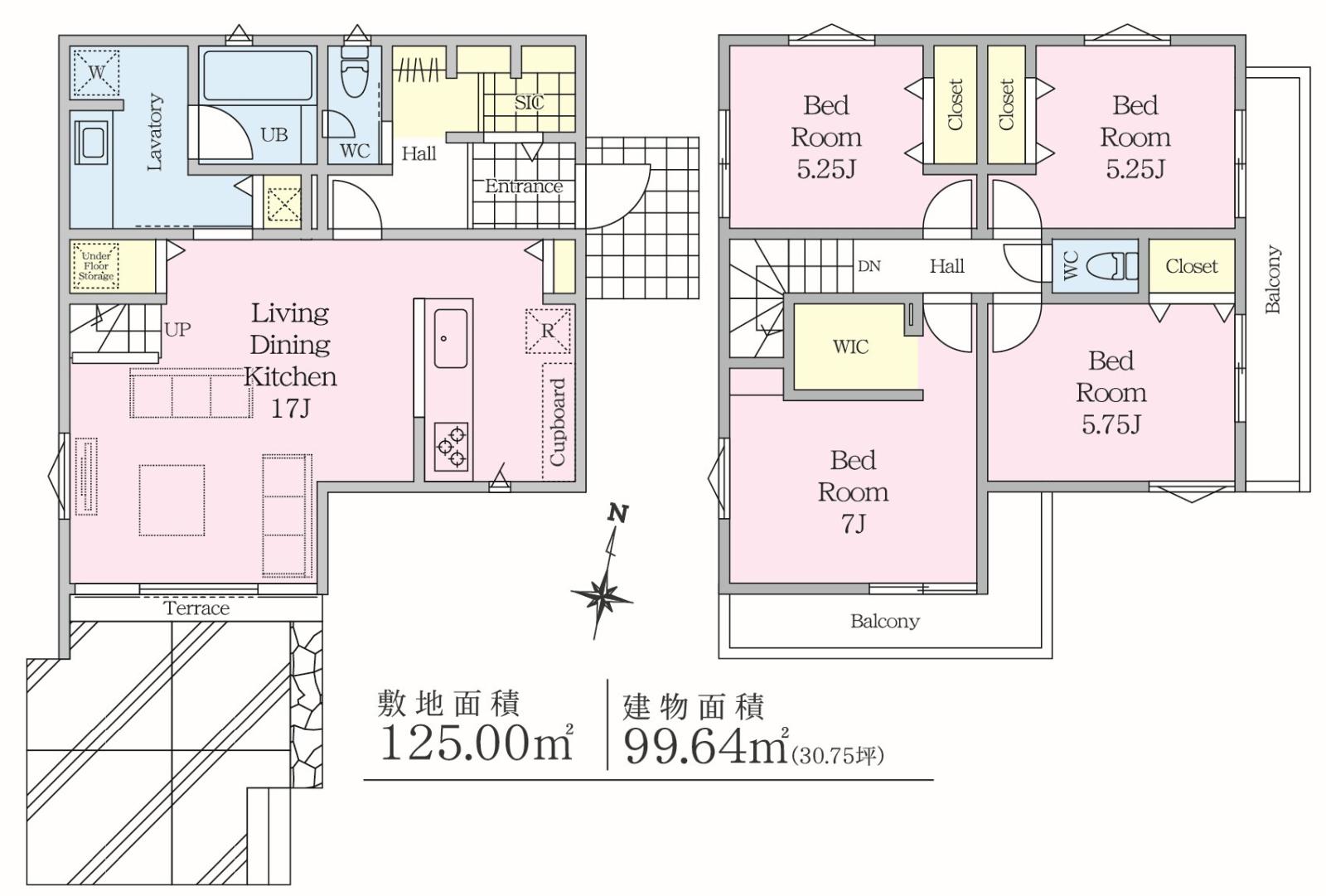 - LDK17帖(1部屋)、洋室7帖(1部屋)、洋室5.75帖(1部屋)、洋室5.25帖(1部屋)、洋室5.25帖(1部屋)