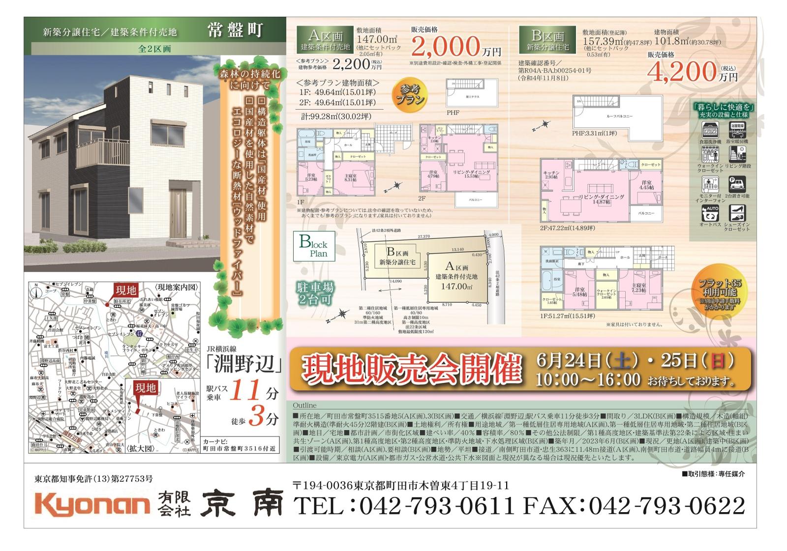 【 現地販売会開催 】町田市常盤町:新築分譲住宅/建築条件付売地 6/24(土) ・ 6/25(日)10:00~16:00 現地でお待ちしております。 詳しくはこちらをクリック!
